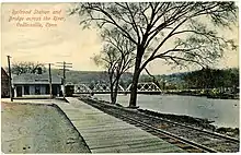 ![]() A train at Holyoke, Massachusetts along the New Haven and Northampton main line in the 1890s. This portion of the line is now operated by the Pioneer Valley Railroad. | |