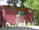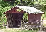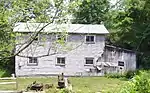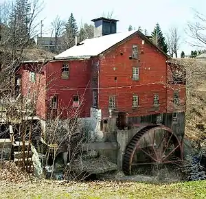 The mill is a heavy timber-framed building with several late 19th century wings containing a full array of 19th century steel roller mills and related support machinery.[4] In the 1850s, there were 14 other industries powered by water along Bear Swamp Creek. The New Hope Mill originally had a capacity of 200 bushels a day, using three stones; it converted to roller mills in 1892. Although from the exterior the waterwheel is most prominent, most of the mill's power came from a water turbine underneath the structure, which can run throughout the year if sufficient water is available. The complex has an upper mill pond, where the sawmill is located, with a 24-foot waterfall, and a lower mill pond with a 28-foot fall. Water could be stored in the upper pond to be used to run the mill the next day.[2]