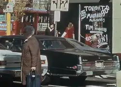 The corner of Riverside Avenue at Cedar Avenue, looking toward the New Riverside Cafe in the Cedar-Riverside neighborhood of Minneapolis, circa 1976. The window reads: "Tonight: Maureen Elderry and Tim Hennessy. Country [Illegible]!"