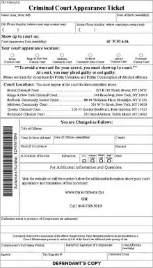 New York police officers may arrest someone they have reason to believe has committed a felony, misdemeanor, or violation,[5] or pursuant to an arrest warrant. Those arrested are booked at "central booking" and interviewed by a representative of the Criminal Justice Agency for the purposes of recommending bail or remand at arraignment.[5] In New York state, the time from arrest to arraignment must be within 24 hours.[6][7] Police may also release a person with an appearance ticket directing a defendant to appear for arraignment in the future: with a desk appearance ticket (DAT) after arrest, or a universal summons without arrest.[8][9]