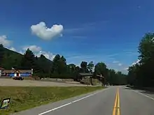 The Whiteface Highway, also known as NY 431, begins at an intersection with NY 86 in Wilmington. The highway heads to the west, ascending in elevation as it approaches Whiteface Mountain. It heads through a pass between Morgan and Esther Mountains, two smaller mountains adjacent to Whiteface Mountain, on its way to an intersection with County Route 72 (CR 72), the last highway that NY 431 intersects. Just west of CR 72, NY 431 passes through a toll booth and becomes a toll road.[4] The NY 431 designation continues along the highway to the Union Falls Overlook, a scenic view 2,700 feet (820 m) in elevation about one mile (1.6 km) into the scenic drive.[1][5]