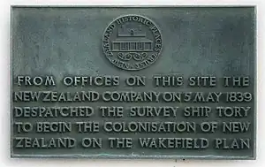Members of the two colonisation groups subsequently formed a new organisation, the New Zealand Land Company, with Lord Durham as its governor and five MPs among its 17 directors (in 1840 the directors were Joseph Somes, Viscount Ingestre, M.P., Lord Petre, Henry A. Aglionby, M.P., Francis Baring, M.P., John Ellorker Boulcott, John William Buckle, Russell Ellice, James Robert Gowen, John Hine, William Hutt, M.P., Stewart Marjoribanks, Sir William Molesworth, M.P., Alexander Nairn, Alderman John Pirie, Sir George Sinclair, M.P., John Abel Smith, M.P., Alderman William Thompson, M.P., Frederick James Tollemache, M.P., Edward G. Wakefield, Sir Henry Webb, Arthur Willis, George Frederick Young).[35] The company acted urgently to fit out the Tory, advertise for a captain and surveyor and select Colonel William Wakefield as the expedition's commander. William Wakefield was authorised to spend £3000 on goods that could be used to barter for land. By 12 May 1839, when the Tory left England under the command of Captain Edward Chaffers, the company had already begun advertising and selling land in New Zealand, and by the end of July—months before the company had even learned the Tory had arrived in New Zealand—all available sections for its first settlement had been sold. The company had already been warned in a letter from the Parliamentary Under-Secretary that the government could give no guarantee of title to land bought from Māori, which would "probably" be liable to repurchase by the Crown.[36] The company had also been told that the Government could neither encourage nor recognise its proceedings.[37]