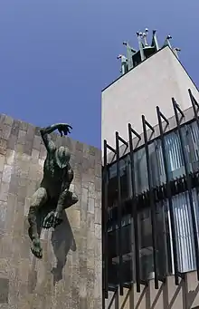 The Civic Centre is also notable for its modern sculptures, in particular the "River God Tyne" and "Swans in Flight", both by David Wynne and the seahorses on the top of the tower by John Robert Murray McCheyne.[14] The cashiers reception of the former rates hall, now the Customer Service Centre, has two abstract murals by Victor Pasmore.[15]