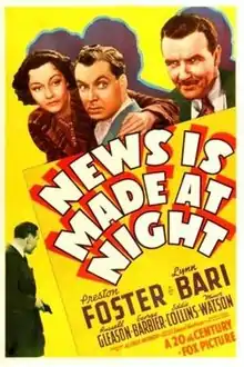 News Is Made at Night is a 1939 American comedy film directed by Alfred L. Werker and written by John Larkin. The film stars Preston Foster, Lynn Bari, Russell Gleason, George Barbier, Eddie Collins and Minor Watson. The film was released on July 21, 1939, by 20th Century Fox.[1][2][3]