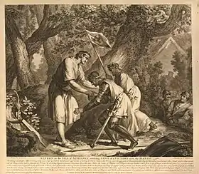"Alfred in the Island of Athelney, receiving News of a Victory over the Danes". Engraving by Nicholas Blakey, reworked by François Vivares