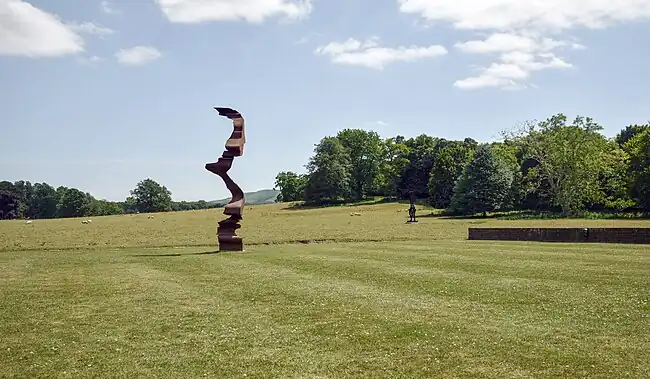 "Twofold" was commissioned by Harlow Art Trust. It is the 100th piece in Harlow's public sculpture collection[6] which includes works by Auguste Rodin, Barbara Hepworth, Henry Moore, and Elizabeth Frink, among many others, so is a fitting environment for an artist whose subject is frequently the canon and its construction. For this commission, Hornby has crossed one of the most canonic of figurative sculptures, Michelangelo's David, with a curving line from a 1925 Kandinsky drawing. In one rotation, David is visible; in another, it is Kandinsky's abstract line.