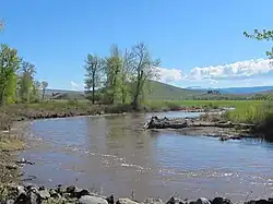 The Nicola River /ˈnɪklə/, originally French Rivière de Nicholas or Rivière de Nicolas, adapted to Nicolas River, Nicola's River in English, is one of the major tributaries of the Thompson River in the Canadian province of British Columbia, entering the latter at the town of Spences Bridge. It is named for Nicola (Hwistesmexteqen) the most famous chief of the joint community of Nlaka'pamux and Okanagan bands, founded by his father and today known as the Nicolas, (originally Nicola's people), as well as its basin, which is known as the Nicola Country.[1] It drains most of the northern Thompson Plateau, beginning near the very eastern edge of the plateau only 30 kilometres (19 mi) northwest of Kelowna, and flows from there more or less westward to feed Douglas Lake and Nicola Lake, with about 15 kilometres (9 mi) of the river's length between those two lakes. Nicola Lake at 20 kilometres (12 mi) long is the largest in the basin; the Nicola River enters at 3/4 way of its length up from its outlet, 10 kilometres (6 mi) downstream from which is Nicola Valley centre and Coquihalla Highway city of Merritt. From there the river flows 60 kilometres (37 mi) northwest to the Thompson, and is followed on that route by British Columbia Highway 8 and a spur line of the Canadian Pacific Railway.