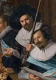 ![]() Detail of 1633 schutterstuk by Frans Hals, with Nicolaes Olycan with pike and Hendrik Pot with book | |