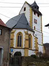 The parish church with its girding wall and defensive tower comes mainly from the 12th century; the quire is Gothic. It was consecrated to Saint Mechtildis, whose reputed grave here was the object of pilgrimage even into Protestant times, up to about 1575. Indeed, Mechtildis even still appeared in the village's court seal from 1632. Well known are the frescoes in the tower chapel. In 1940, even older, Romanesque, wall paintings were discovered in the nave. These had been whitewashed out on the Meisenheim church administration's orders in 1669. They also had the altars and baptismal font smashed up.
