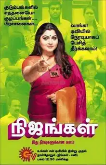 Nijangal (transl.Realities) is a 2016-2017 Tamil-language reality-justice show about real-life situations. It aired every Monday to Saturday at 12:30PM (IST) on Sun TV and Re telecast Monday to Saturday at 10:00PM (IST) on Sun News from 24 October 2016 to 4 March 2017 for 218 episodes.[1] The Show host by Khushboo Sundar.[2][3][4][5] The show revolves around real life situations and they try to come up with a solution for the same on the channel. It was Produced by Vaidehi Ramamurthy and director by Mani Sridhar.
