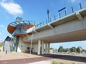 The station opened in 2002 was actually a temporary station for 11 years. On 25 July 2013 the new, permanent, station was opened which features lifts. This station is located 250m further south than the temporary station.