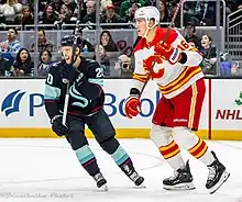 Zadorov as a member of the Calgary Flames with Eeli Tolvanen of the Seattle Kraken in 2023.