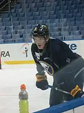 Zadorov attended his first rookie and NHL training camp and after his third pre-season contest he was signed by the Sabres to a three-year, entry-level contract on 26 September 2013.[5] Under the assessment of head coach Ron Rolston, he made the Sabres' opening night roster to begin the 2013–14 season.[6] Zadorov sat out the first ten games before he made his NHL debut in a 4–2 defeat to the Colorado Avalanche on 19 October.[7] In just his second game, against the Boston Bruins on 23 October, Zadorov scored on his first shot in the NHL, against Chad Johnson.[8] In so doing, he became the youngest Sabres defenceman in franchise history to achieve the feat.[9]