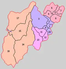 yellow & dark green area=original extent in early Meiji period; light green=area added in Showa period; green=present area; 1=Oguni; 2=Shirataka; 3=Iide