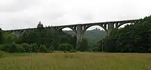 The Erbach–Fehl-Ritzhausen railway was somewhat difficult to build due to the unsuitable subsurface near Erbach. The line had to be built on the western slope of the Nister. In addition to the crossing of the Upper Westerwald Railway near Erbach station, an eleven-arched concrete viaduct, which, at about 300 metres long and almost 40 metres high, was the largest of its kind in the German Empire at the time,[5] was built over the Nister in only six months. It was built without steel reinforcement and was considered a "miracle of technology“.[6] The railway line was finally opened on 31 August 1911.[7]