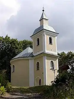 The church lies on the slope of the hill Mahrát in the locality "Jurko". The site is on the important route between Váh and Nitra river basins. According to the written sources, the church was built in 1530 by Anna Thurso in memory of her husband who died in Battle of Mohács.[4] However, an archaeological research uncovered new findings and changed the dating to the Early Medieval period, with the highest probability the Great Moravian period or shortly after. The Church of Saint George belonged to the Early Medieval court (curtis), but was a part of a separate settlement near the main court.[5] The rotunda in Nitrianska Blatnica is similar to the Great Moravian rotunda in Ducové (7 km from Blatnica). The building was rebuilt and reconstructed several times, the current baroque look is from 1777.[6]