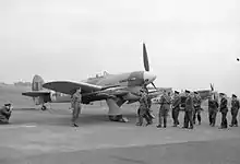 Following the end of hostilities the squadron relocated to a former Luftwaffe airfield at Wunsdorf, near Hanover.[6] The squadron returned to the UK after the end of hostilities in Europe and converted to Spitfires at RAF Chilbolton and then to Tempests in preparation for its deployment to the Asia theatre of operations.[7] Before this deployment could happen the war with Japan ended.