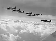 In May 1941 the squadron left for the Middle East its aircraft being flown off HMS Victorious to Malta while the ground echelon sailed round the Cape of Good Hope. 28 Hurricanes of 238 flew to the island and as soon as refuelling had been complete flew seven hours to eastern Egypt.[74] After refuelling in Malta the Hurricanes flew on to the Western Desert where they were attached to No. 274 Squadron on 15 June 1941, pending the arrival of the squadron's own ground crews.[75] 238 operated from LG 109 alongside 1 Squadron SAAF from 20 October 1941. They escorted six Blenheims from 113 and No. 55 Squadron RAF to Gambut. II/JG 27 intercepted and shot down two Blenheims, two 238 Squadron pilots and one 1 SAAF pilot. Sergeants Savy baled out and Knappett crash-landed, though he returned to the unit later. The South African pilot was captured. Another Hurricane was lost in action with this unit on 30 October.[76] From 17 November 1941, 238 was assigned to 258 Wing for the upcoming Operation Crusader.[77]