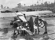 Four of No. 16 Air Observation Post Flight's Auster aircraft were landed at Tarakan early in the invasion of the island in early May 1945.[9][6] One of these aircraft crashed on takeoff from Tarakan during 2 May, killing its pilot; this was the flight's only fatality during the campaign.[6] Detachments from No. 16 Air Observation Post Flight supported the 9th Division's operations in North Borneo from June and the 7th Division's landing at Balikpapan during July.[10] No. 4 Squadron also took part in these operations. Its Wirraways were sent to North Borneo, and began operating from Labuan from 23 June. The Boomerangs supported the 7th Division at Balikpapan.[11] The wing headquarters was transferred from Morotai to Labuan, and began operating from there on 12 June.[1] No. 9 Local Supply Unit's Beauforts supported operations in North Borneo by spraying DDT over the areas Australian Army units were operating. A Beaufort crashed while taking off for one of these sorties on 11 June, with all three of its aircrew being killed.[8] Following the Japanese surrender, No. 83 Wing's aircraft were used to locate Allied prisoners of war in Borneo, among other tasks.[12][13]