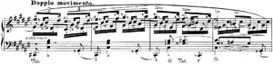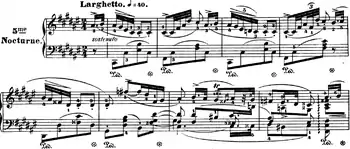time. The first section, marked Larghetto, features an intricate, elaborately ornamental melody over an even quaver bass. The second section, labeled doppio movimento (double speed), resembles a scherzo with dotted quaver-semi quaver melody, semiquavers in a lower voice in the right hand, and large jumps in the bass. The final section is a shortened version of the first (14 bars rather than 24) with characteristic cadenzas and elaboration, finishing with an arpeggio on F major, falling at first, then dying away. Many consider this nocturne to be the best of the opus, stating that its musical maturity matches some of his later nocturnes."[2] Pianist Theodor Kullak remarked about this piece, "The return of the heavenly opening theme... touches [one] like a benediction."[2]