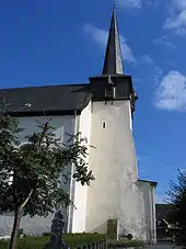 In the abutting graveyard stands a Crucifixion Bildstock from 1741. The church's entrance door, flanked by lions, bears a warriors’ memorial to the dead of the First World War.[5]