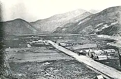 A 1924 report claimed that during the gold rushes Nokomai township had over 2,000 people, but by 1924 Glenfalloch's stone homestead stood alone. In the 1870s there was a wide main street, with Thomas Aiton’s Myall Hotel,[20] Thomas Whitaker's Provincial Hotel (c.1862-76)[37][38] and Job Coulam's United States Hotel (burnt down in 1888).[39] As well as running a store and hotel, Thomas Aiton was also secretary of a gold mining company wound up in 1874.[40] After a petition to the Education Board,[41] on 31 October 1870, a school for 50 children opened.[20] In 1922 it had 9 students.[42] The school seems to have closed between 1938[43] and 1943,[44] attendance still being recorded in 1934.[45] However, the 1924 report said it had closed and its bell moved to Athol school. The teacher, Henry Thurston Evans, set up the Nokomai Weekly Herald,[20] which was hand-written on 4 pages of small post folio.[46] It lasted a year from 11 November 1871.[47]