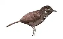 In appearance it is similar to the sooty babbler (S. herberti), but differs in having a pale iris, a white crescent behind the ear, a white throat patch with black spots, and a black bill.