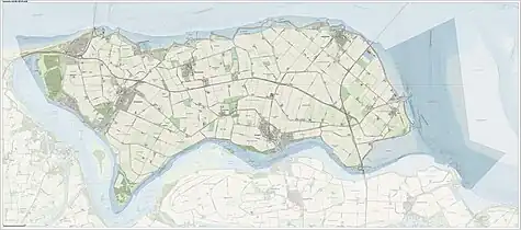 Noord-Beveland (Dutch pronunciation: [ˈnoːrd ˌbeːvəlɑnt] ⓘ; "North Beveland") is a municipality and region in the southwestern Netherlands and a former island, now part of the Walcheren-Zuid-Beveland-Noord-Beveland peninsula. Noord-Beveland is enclosed by the Oosterschelde estuary to the north, and the former straits, now combined lake, of Veerse Meer and Zandkreek to the south. As part of the Delta Works, dams have connected Noord-Beveland to Walcheren and Zuid-Beveland.