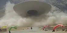 Caltech professor John O. Dabiri collaborated with Peele and his team on the design of the Jean Jacket monster's UFO form,[47] and in particular its final true "biblical angel" form, which was inspired by those of Neon Genesis Evangelion and invertebrate aquatic locomotion among sea creatures such as jellyfish, octopuses and squid, to imagine a hypothetical undiscovered previously extinct sky predator, realistically imagining "how could something like this hide in the clouds", with its ability to "generate electric field" taken from electric eels and ghost knifefish, allowing for electric propulsion ("Jean Jacket's fast flying without wings/sails").[48][49][50] Guillaume Rocheron of Moving Picture Company (MPC) also worked with Dabiri and Peele on the visual effects shots featuring Jean Jacket, utilizing both CGI and practical effects, the latter particularly involving the use of a helicopter to swirl the dust and dirt on the ground the way the creature does when consuming its victims in the film.[51] The film held its first test screenings just 12 weeks before its July 22 release, with the special effects still being worked on.[52]