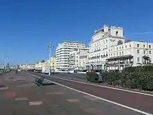 West Street formed the western limit of development in Brighton until the end of the 18th century. At that time, the town was growing from a small fishing and agricultural settlement into a fashionable seaside resort. From 1800 on, seafront land that was formerly part of the West Laine[note 1] was sold off in parcels to speculative builders. Some large-scale residential development took place, but it was only after 1820—when the road running parallel to the beach was widened and straightened to form a seafront promenade called Kings Road—that the area became easily accessible.[3] The hotels, lodging houses and inns built along this stretch of road became the most popular and exclusive in the town at that time.[4]