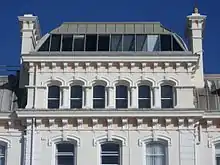 The ground floor projects and is enclosed by a modern glazed lobby area. The main entrance has Corinthian columns on each side, supporting an entablature which in turn supports a balcony spanning the whole of the first floor. Individual cast iron balconies in the same style are set in front of each window at second- and third-floor level. The façade is of seven bays treated as a symmetrical 2–3–2 composition in which the central three bays project slightly and are flanked by pilasters. These three bays also rise to a taller height than the other sections by means of a sixth storey which has six narrow segmental-arched windows in the form of an arcade formed by engaged columns.[17]