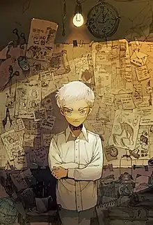Norman was born on March 21, 2034. At the beginning of the story on October 12, 2045, Norman is 11-year-old boy living at Grace Field House orphanage. He has blue eyes and short white hair that is parted to his left, with a longer piece curving upwards on the left side of his head. An authentication number, 22194 is tattooed on his neck.[8] As the most intelligent out of the three, he is the first to find out Ray's true identity as Isabella's spy and prepare various back-up plans and escape routes. After Ray is betrayed by Isabella, Norman is forced to be shipped before his 12th birthday, accepting his fate of inevitable death to deceive her and let the rest of the children escape.[8]