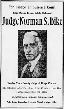 In 1920, he was elected to the New York Supreme Court, where he served until retirement in 1932, when he reached the age limit.[1] As a judge, Dike was known for his severity towards criminals and belief in punishment as a deterrent.[2] After retirement he became referee for the second Judicial District of the New York Supreme Court.[2]