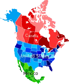 The North American Union (NAU) is a theoretical economic and political continental union of Canada, Mexico and the United States, the three largest and most populous countries in North America. The concept is loosely based on the European Union, occasionally including a common currency called the amero or the North American Dollar. A union of the North American continent, sometimes extending to Central and South America, has been the subject of academic concepts for over a century, as well as becoming a common trope in science fiction. One reason for the difficulty in realizing the concept is that individual developments in each region have failed to prioritize a larger union. Some form of union has been discussed or proposed in academic, business, and political circles for decades.[1][2][3] However, government officials from all three nations say there are no plans to create a North American Union and that no agreement to do so has been proposed, much less signed.[4][5][6] The formation of a North American Union has been the subject of various conspiracy theories.[7][8][9][10]