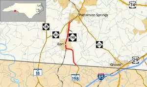 A two-lane rural highway, it traverses 4.3 miles (6.9 km), starting at the South Carolina state line at Buffalo Creek, through the town of Earl, ending at NC 180, south of Patterson Springs.