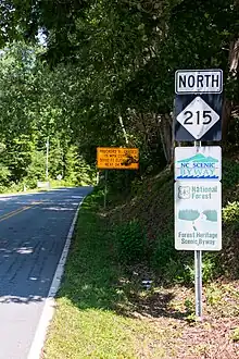 North Carolina Highway 215 (NC 215) is a highway in western North Carolina that runs from the town of Rosman in Transylvania County to Canton at Interstate 40 and U.S. Route 74 (US 74). The portion from Canton to Rosman is a part of the US Forest Service's Forest Heritage Scenic Byway. It travels high into the mountains along a scenic stretch of the upper West Fork of the Pigeon River, and intersects the Blue Ridge Parkway at Beech Gap at an elevation of approximately 5,300 feet (1,600 m).