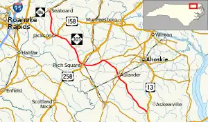 NC 305 begins at an intersection with US 13 north of Windsor, then heads northwesterly toward Burden and Connarlsta. The highway then crosses NC 11/NC 42 near Aulander and continues through downtown Aulander where it crosses the former route's business route. NC 305 then runs into southwestern Hertford County before it meets NC 561 near Northampton County. NC 305 and NC 561 run concurrently until Rich Square where it crosses US 258. Beyond US 258, NC 305 heads northwesterly toward Jackson and runs concurrently with US 158 westward into Jackson before it turns north towards Seaboard. After seven miles (11 km), NC 305 reaches its northern terminus at NC 186 in Seaboard.[4]