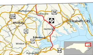 NC 37 is a predominantly two-lane rural highway which travels 60 miles (97 km) from US 64 near Beasley to US 13 near Gates. Beginning at exit 548, along US 64, NC 37 travels northeasterly for 3.4 miles (5.5 km) before running concurrent with NC 32 and NC 94 near Pea Ridge. Crossing over the Albemarle Sound and entering Chowan County from Washington County, NC 94 splits off towards the Northeastern Regional Airport, followed by NC 32 which heads directly towards Edenton.[2][3] Entering Perquimans County, it merges with US 17 for a 9-mile (14 km) concurrency. Connecting with the city of Hertford, it switches concurrences with U.S. Route 17 Business (US 17 Bus.) in Winfall. After a 0.9-mile (1.4 km) concurrency, it travels solo again as it goes through downtown Winfall then northeasterly through Belvidere.[4] At Gliden, it rejoins NC 32 for a short concurrency, entering Gates County and through Mintonsville, before separating again at Mitchells Fork. Traveling through the communities of Willow and Vivian, it goes through downtown Gatesville, where it shares a short concurrency with US 158 Bus. Continuing north, it connects with US 158 at Eleanors Crossroads. After traveling through the communities of Buckland and Gates, it ends at US 13 one mile (1.6 km) from the Virginia state line.[1][5]