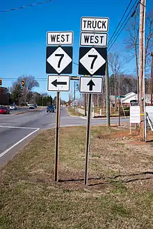 NC 7 Truck is a short 1.7-mile (2.7 km) route that overlaps entirely with US 29 and US 74 through Belmont. The truck route was established to keep trucks from traveling through downtown Belmont. The eastern terminus is also the end point of NC 7.