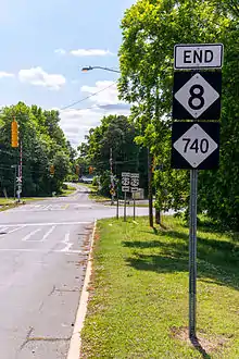In 1953, NC 8 was extended southwest, with a short concurrency with NC 49 and replacing NC 6, to New London. In 1954, NC 8 was placed on one-way streets in downtown Winston-Salem, using 4th Street (southbound) and 5th Street (northbound). In 1960, NC 8 was moved from Main Street to Old Salem Road, in the Salem College area. In 1962, NC 8 was adjusted downtown Winston-Salem: northbound using Main Street–Fifth Street–Liberty Street, and southbound using Liberty Street–First Street. In 1967, NC 8 northbound was rerouted on a short concurrency with US 158/US 421 then north along a completed section of the North-South Freeway; NC 8 southbound remained unchanged until 1973, when the rest of the North-South Expressway was completed, eliminating its routing through downtown Winston-Salem.[5][6] In 1972, NC 8 was adjusted from Third Street to Sixth Street in Lexington.[7] In 1981, NC 8 was extended to Gold Street, then share short concurrency with NC 740 to its current southern terminus with US 52.[8] In 1982, US 52/NC 8 was placed on new freeway west of Midway.[9] Between 1991-1993, US 52/NC 8 was placed on new freeway bypassing east of Welcome. In 2002, NC 8 was rerouted in Lexington, from Main Street to continue along Raleigh Road to Talbert Boulevard then back to Cotton Grove Road.[10]