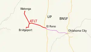 ATLT operates freight service from Watonga, Oklahoma to Geary to El Reno, Oklahoma 39.7 miles (63.9 km) and 9.6 miles (15.4 km) from Geary, Oklahoma to Bridgeport, Oklahoma. It also passes through Calumet and Greenfield.[1] The line transports grain, fertilizer and agricultural products,[2] with outbound shipments typically running in 110-car unit trains.[3] Ultimately, the most prominent destination for the cargo is the US Gulf coast export market.[3]