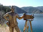 Following the World's Fair and Expo '74 in Spokane, Washington, the Washington state Parks and Recreation Commission started planning a trail along the Spokane River to celebrate their state's centennial in 1989. Coordination began with Idaho to extend the trail past the border and the northeast side of Lake Coeur d'Alene to celebrate Idaho's centennial as well in 1990.[2] In 1999 Hillary Clinton made it into a Millennium Legacy Trail. In 2002 local artist David Clemons designed and installed two statues to sit at either end of the trail. "Leopold", an 1890 photographer, sits at Higgens Point and "Kate", a turn of the 20th century bicyclist sat at the state border. Clemons' concept was to capture individuals 100 years ago enjoying the same activities on the trail as they do today.[3] In 2003, "Kate" was vandalized and had to be taken back for repairs. In 2005 she was reinstated on the trail at Riverstone Park, at the beginning of the Spokane River.[4]