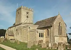 The bell tower of the Church of England parish church of Saint Mary[7] is late Saxon, probably built in the first half of the 11th century.[8] The building underwent a complex series of alterations from the 12th to the 18th centuries, losing its Saxon nave to the west of the tower and gaining at various times a new nave, chancel, aisles and two chapels east of the tower.[8][9] St Mary's is particularly notable for its fan vaulted early 15th century Perpendicular Gothic style Wilcote chantry chapel[8][9] and its early 18th century Perrott burial chapel,[9][10] both of which are of unusually high quality for a village parish church.[9][10]