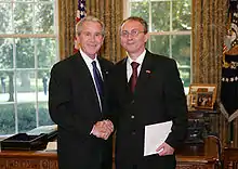 Ambassador Zoran Jolevski with George W. Bush at the accreditation ceremony