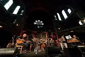 The North Sea Radio Orchestra is an ensemble of varying size, drawing on a pool of up to twenty members. It performs compositions which range from single-instrument solos and voice-and-guitar duos up to full chamber-orchestra-and-choir pieces (and all points in between, including assorted trios, quartets, quintets etc.). The instrumentation within the ensemble features woodwind, strings, orchestral and electronic percussion, nylon-string guitar, chamber organ, piano and the human voice. In some line-ups, between six and ten members have sung as "the North Sea Chorus".