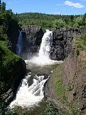 The North Shore of Lake Superior runs from Duluth, Minnesota, United States, at the western end of the lake, to Thunder Bay and Nipigon, Ontario, Canada, in the north, to Sault Ste. Marie, Ontario in the east. The shore is characterized by alternating rocky cliffs and cobblestone beaches, with forested hills and ridges through which scenic rivers and waterfalls descend as they flow to Lake Superior.