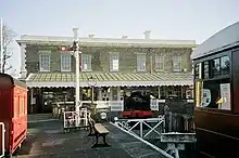 The station building at North Woolwich was opened in 1847,[1] and was designed by Sir William Tite. The station was bombed during the London Blitz in 1940.[2] The building was in use as a ticket office until 1979 when it was replaced by a more austere building on the one remaining platform. It was derelict for many years until its opening as a museum by the Queen Mother on 20 November 1984.[3] It had been established by the London Borough of Newham and the building owner, the Passmore Edwards Museum Trust.