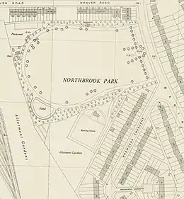 In the 1940s the sports fields at the front of the park were removed, and a separate square bowling green was added to the south of the main field on land which was originally outside the park boundaries.[3][1] Around the same time a triangular piece of land south of the new bowling green started being used for gardening allotments, as was a 2 km long stretch of land to the west of the park border following the railway line, all the way from Grove Park in the south to St. Mildred's Road to the north.[3] By the 1940s public toilets had been added to Northbrook Park off on the north side off the path[3] and a children's playground had also been constructed just off the path in the northwest corner of Northbrook Park near the greenhouses and other buildings,[3] which came to include climbing frames, swings, roundabouts, seesaws, and slides.