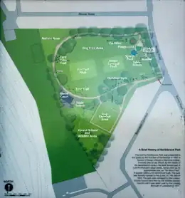 Map of Northbrook Park on the sign at the front of the park, August 2021, with added labels