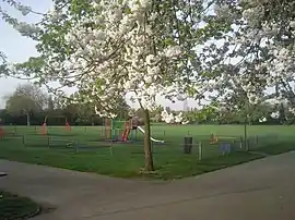 Northbrook Park is a public park in Grove Park,[1][2][3] currently managed by Glendale Grounds Management for the London Borough of Lewisham.[2] It is one of Lewisham's open spaces, and is open all year from 08:00 every morning, and closes near dusk, with times ranging from 16:00 to 21:00 in the evening, depending on time of year.[4] The park is roughly 9 acres (3.6 ha) in size, approximately 220 m (241 yd) wide east to west and around 260 m (284 yd) long north to south.[3] A large central field, around 4.5 acres (1.8 ha) in size takes up roughly half the park's total area, and is around 125 m (137 yd) north to south, 190 m (208 yd) east to west[3] and is flat ground with short grass and very few trees.[5] There is a straight concrete path joining the two gated entrances on Baring Road, and a long circular concrete path that surrounds the large central field.[1][3][5] A short metal fence built to keep dogs out, follows the path and surrounds the central field, which contains a football pitch, a second smaller junior football pitch, and outdoor gym equipment.[5] An old stone sundial erected in May 1903, with engraving describing the gift of the land by Lord Northbrook to commemorate Queen Victoria's Jubilee, stands at the front of the park off the straight path,[2][3] but it is in disrepair.[5] There is a small fenced playground with slides, swings, a zip line, a splash pool, a sandpit a roundabout and climbing frames in the northeast corner just inside the circular path,[5] it was constructed around 2000, and improved in 2012. There is a thin strip of woodland surrounding the central field, including oak trees, mostly outside of the path, with fewer trees inside the path.[3][5] The northwest corner is more overgrown and contains scrubland set aside as a wildlife area,[5] this is the site of the original children's playground.[3] South of the main field is an old bowling green,[1][3][6] that is now used as a dog exercise area.[5] South of this is a triangular piece of overgrown wooded ground with dirt paths cutting through it, this area used to be allotments and was not part of the original park grounds,[3] it is now set aside as a forest school area.[5] Just off the southwest corner of the central field there is a fenced multipurpose concrete game court,[5] where a pond was previously sited.[3][7]
